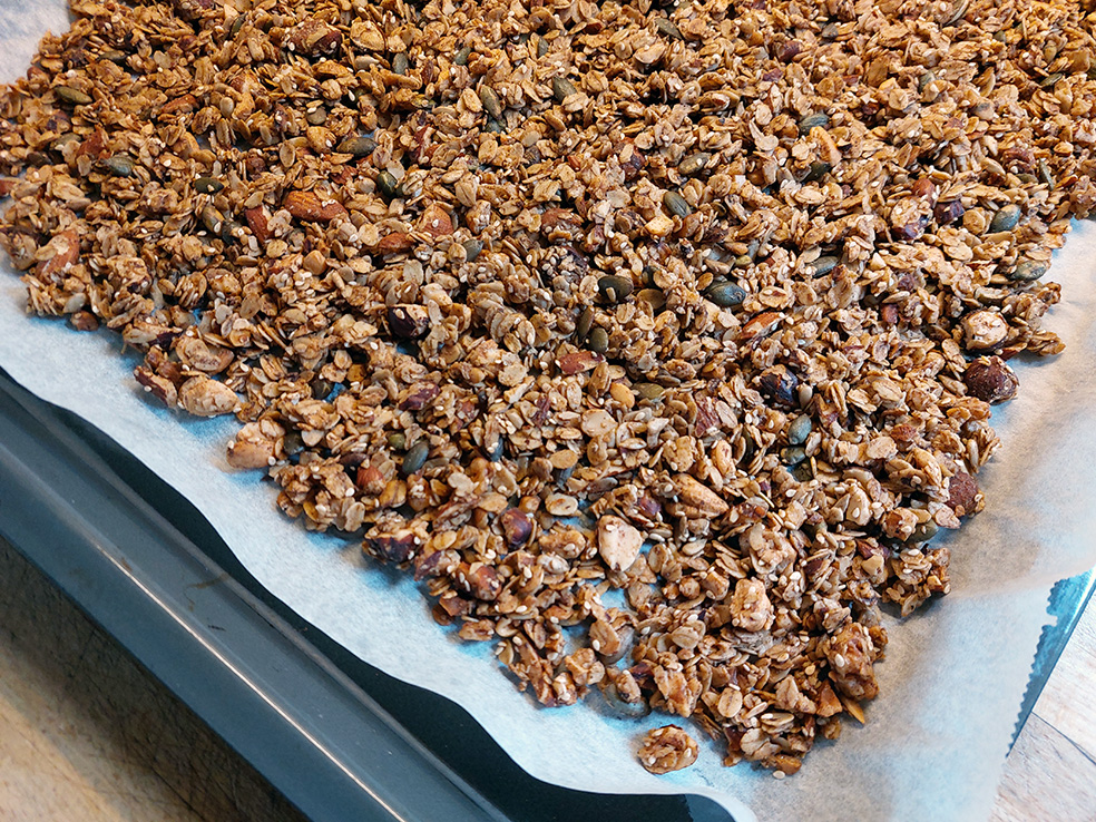 Meng de droge ingrediënten in een grote kom: gehakte noten, havermoutvlokken, sesamzaad, zonnebloempitten, pompoenpitten, kaneel en zout. Warm en roer de kokosolie en de ahornsiroop enkele minuten in een steelpan, totdat de caramelgeur van de ahornsiroop vrijkomt. Olie en siroop mengen niet echt goed, maar dat is geen probleem. Giet het mengsel bij de droge ingrediënten en schep heel goed door.
