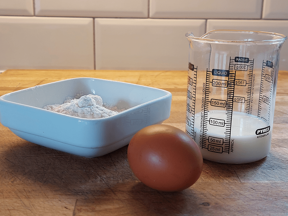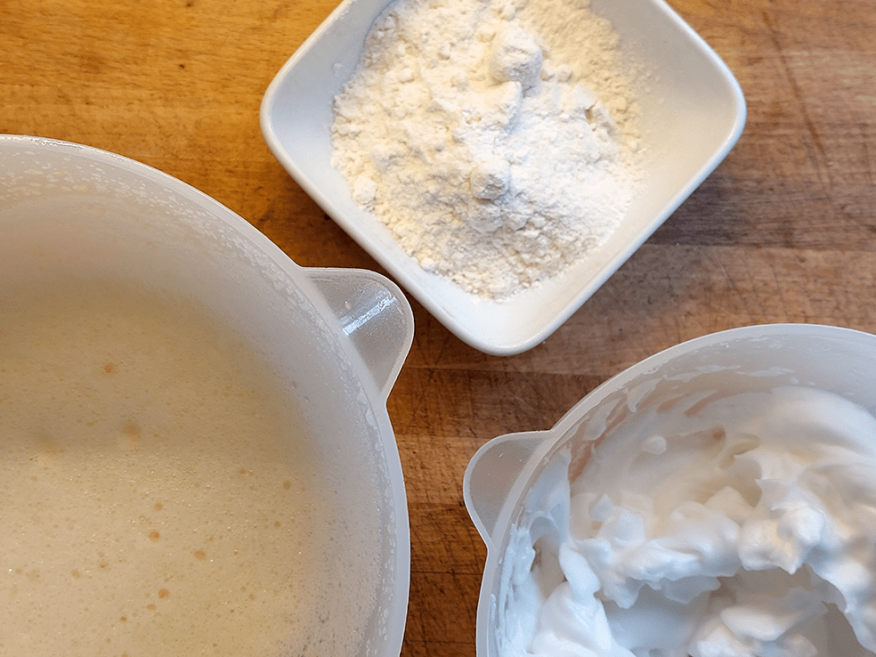 Splits het ei: het eiwit in de kleinste kom. Voeg een snuf zout toe aan het eiwit en klop dit eerst met de mixer stijf tot pieken. Klop vervolgens met de mixer het eigeel met de melk los en schuimig. Zeef de bloem en het bakpoeder erboven en meng met een garde tot een egaal mengsel. Spatel er vervolgens het eiwit in twee of drie delen luchtig doorheen.