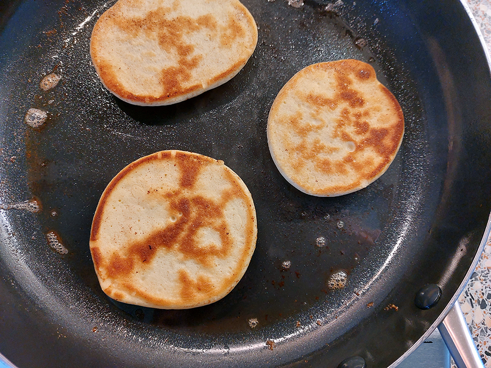 Smelt een klontje boter in een grote koekenpan. Leg met een juslepel drie hoopjes beslag in de pan. Als de dikte goed is loopt het beslag een klein beetje uit, maar blijft er een dikke laag staan. Houd het vuur middelhoog: je wilt dat de pannenkoekjes rustig aan een kant bruinen en bovenop wat uitdrogen. Dit duurt wel enkele minuten. Als ze goudbruin zijn aan de onderkant (dit wordt de ‘mooie kant’) kun je ze voorzichtig omdraaien met een spatel of kaasschaaf. Laat ook de andere kant goudbruin worden.