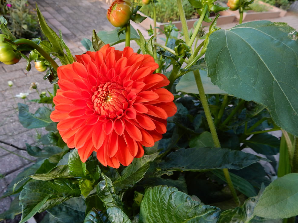 ‘Happy Halloween‘ is een decoratieve dahlia in pompoen-oranje. De plant is in alle delen grof (“bloemkooluhh!”) maar bloeit wezenloos goed. Een nadeel is dat de grote bloemen vaak te dicht op elkaar zitten en elkaar verdringen. Dat maakt het dan weer moeilijker om een mooie bloem voor de vaas te snijden. Deze gaat er uit.